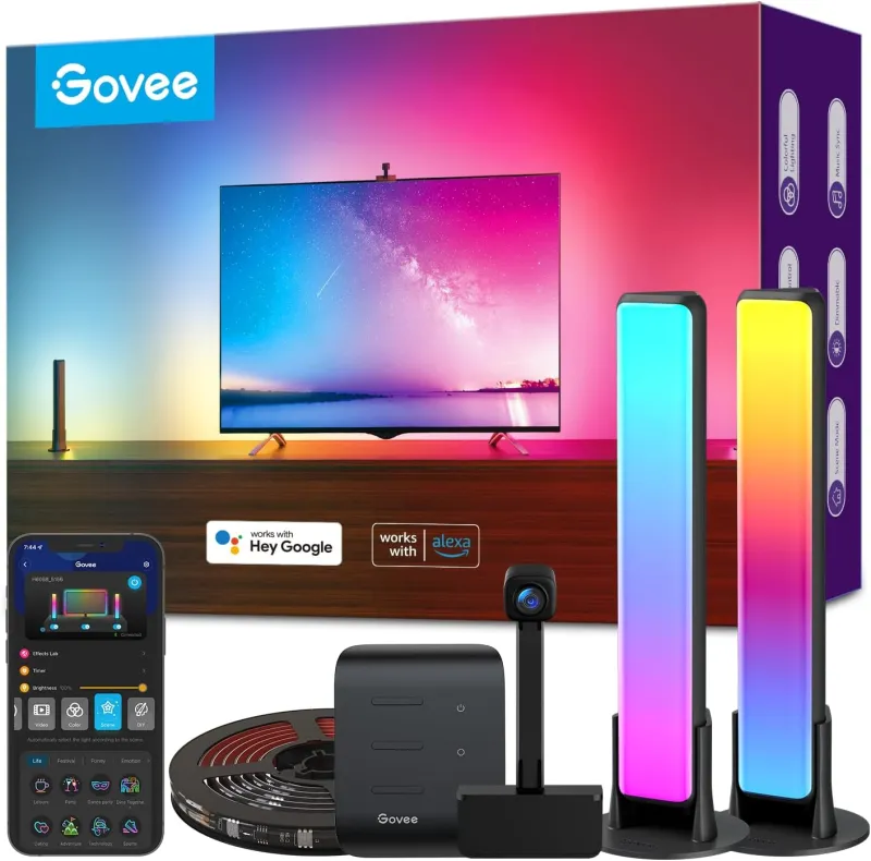 Govee H6054 light panels fully synchronize with images and audio from your TV, bringing your games, movies, and music to a new level. 16 million colors and 23 unique modes. Voice activation with simple voice commands via Alexa or Google Assistant. The intelligent camera detects the colors on the TV screen and automatically applies them to the light bars, providing real-time synchronization without the need for an HDMI cable or the limitations of streaming services. The internal microphone easily harmonizes with your music or ambient sounds coming from your PC. 8 music modes to enhance live concerts, karaoke sessions, or gaming.