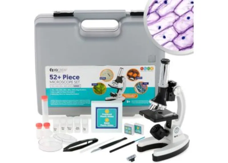 AmScope 120X-1200X 52-pcs Kids Beginner Microscope STEM Kit with Metal Body Microscope, Plastic Slides, LED Light and Carrying Box (M30-ABS-KT2-W)