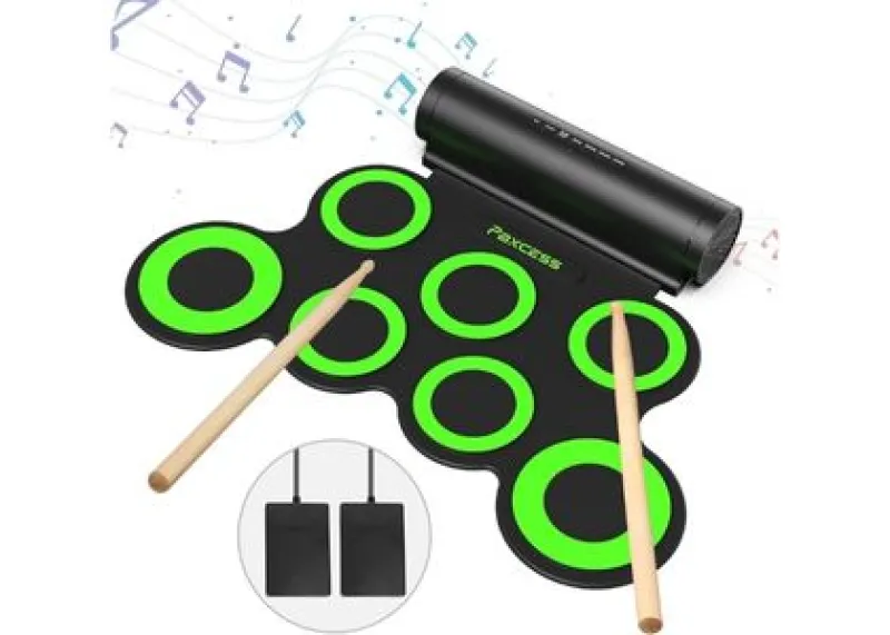 PAXCESS Electronic Drum Set, Roll Up Drum Practice Pad Midi Drum Kit with Headphone Jack Built-in Speaker Drum Pedals Drum Sticks 10 Hours Playtime