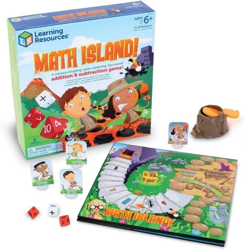 Math Island is an educational board game where players must escape the island using math skills. Players roll the dice to receive an addition or subtraction problem within 20. Whoever solves the problem moves their token forward by the number of spaces equal to the answer. If the token lands on a "danger" space (like quicksand or a guard), the player must follow the instructions on that space, which could mean moving back or skipping a turn. The winner is the first to reach the finish line, avoiding dangers and solving math problems correctly.