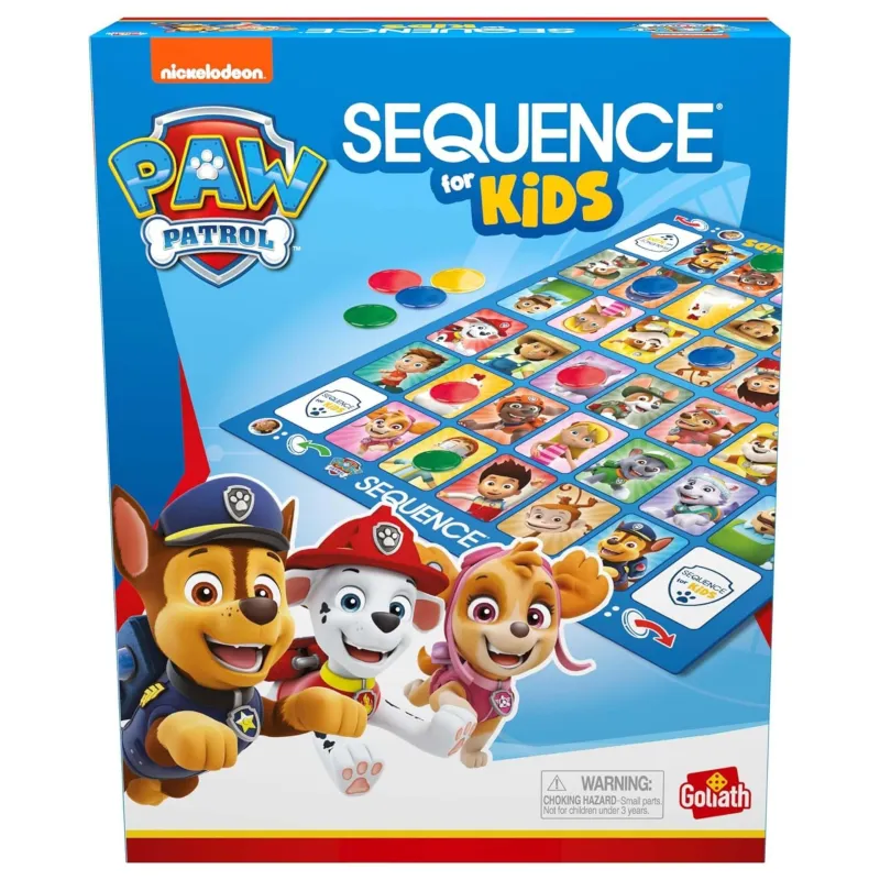 The next game in our family collection is Paw Patrol Sequence for Kids. It’s a simplified, themed version of the classic Sequence, specifically adapted for younger players. Unlike the original Sequence, which uses playing cards and includes more strategic "joker" cards to remove an opponent’s chips, the Paw Patrol version focuses on visual matching with characters from the show. There are no suits or numbers, making it intuitive for preschoolers. The goal of the game is to be the first to line up four chips in a row (horizontally, vertically, or diagonally) on the game board featuring character images. Players take turns drawing cards from the deck, choosing one to play by discarding it and placing their chip on the corresponding space on the board, then drawing a new card. The inclusion of two "free paw" spaces (similar to corner spaces in the original game) adds flexibility, allowing them to be part of any sequence.