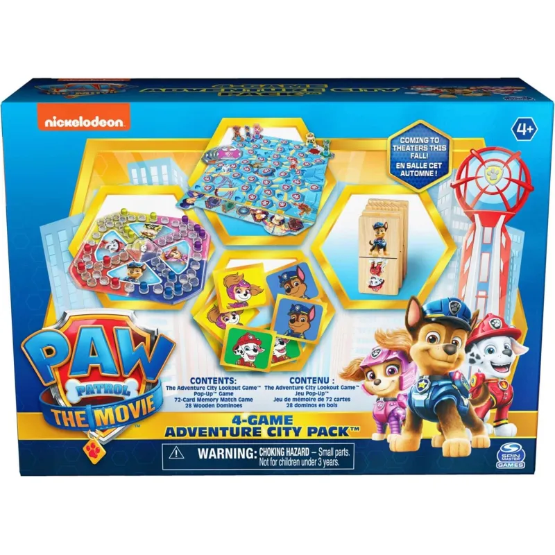 PAW Patrol: The Movie 4-Game Adventure Pack – memory match, pop-up fun, wooden dominoes, and lookout games! Perfect for kids 4 and up.
